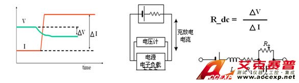 電動車所需動力電池需要并聯電池芯來提供大電流使用,此電池芯阻抗一致性為重要之參數,若阻抗不一致,會影響電池使用壽命。致茂電子提供最新直流阻抗量測方案,方法為設定放電電流變化(ΔI)及量測電壓變化量(ΔV),然后通過ΔV/ΔI 計算電池內阻,如下圖示: