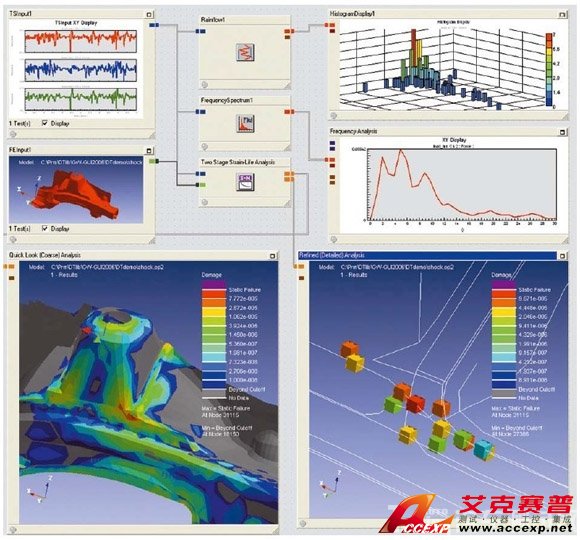 數據采集器所記錄的原始數據通常需要進行分析處理才能變成工程中有用的信息。 原始數據的常規處理通常包括:信號的顯示、編輯、算術及三角運算;頻譜分析;數據格式轉換;單位轉換、元數據處理及報告等。對于疲勞耐久性而言,需要鑒別出原始數據中所包含的異常信號并修正這些信號,通過不同的方法對數據的有效性進行檢驗。需要將時域數據進行付里葉變換,獲得信號中的頻率內容,或者進行雨流計數得出數據中包含的循環頻次信息。在零部件臺架試驗部門, 需要將采集的數據根據疲勞等效原理轉換成一個加速試驗所需的輸入數據。而在 CAE 分析部門,則需要從數據中提取出有限元分析、多體動力學分析和疲勞壽命分析所需要的時間域有效載荷譜。另外,從實測量中直接預測疲勞壽命也是耐久性分析中的一項內容。ICE-flow GlyphWorks 就是英國 nCode 公司為了滿足上述工程需要而開發的新一代數據處理和疲勞分析工程軟件。