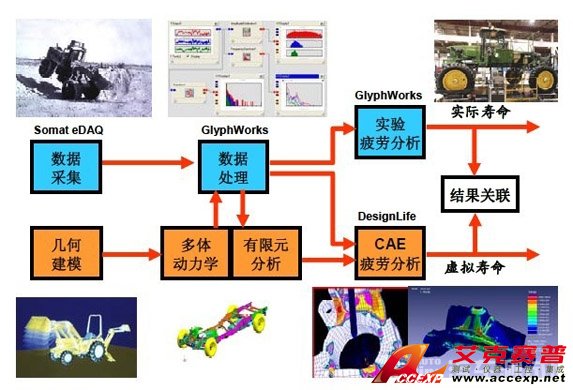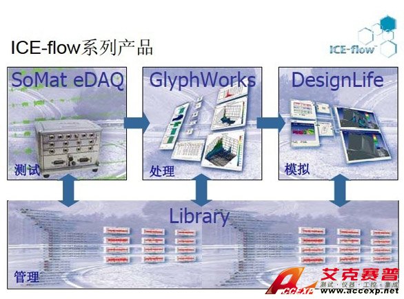 作為著名的疲勞耐久性技術服務公司之一的英國恩科(nCode)國際有限公司開發了一整套用于汽車耐久性設計、分析、試驗及管理的硬件和軟件工具——ICE-flow系列產品。包括:數據采集器 Somat eDAQ、數據分析處理及實驗疲勞軟件 GlyphWorks、CAE 疲勞分析軟件 DesignLife 和耐久性數據管理軟件系統 Library。ICE-flow 集工程數據采集分析處理、疲勞壽命分析模擬、實驗室臺架加速和遠程數據傳遞及管理于一身,是進行一體化抗疲勞設計必備的一個分析工具, 也是進行異地協同設計的有效工具。 ICE-flow系列產品如圖 2所示,以下對各功能分別進行介紹。