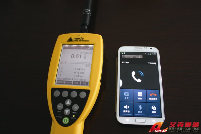 圖為電磁測試儀(www.zzhbled.com.cn/product/gaosiji/)測試電話輻射強度