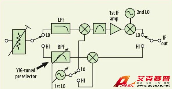 “高頻帶”頻率范圍實際上不能通過與低頻帶范圍一樣的模塊圖來創建,這是因為初級IF放大器將不得不工作在某個頻率下,該頻率下的放大器噪聲和失真總是無法滿足操作人員的要求。如圖1所示的備選模塊采用單個轉換步驟到IF輸出。在這個模塊圖中,初級混頻器中的鏡像響應僅通過兩倍IF大小的頻率(或大約600MHz)來間隔。這些鏡像在頻譜分析儀中不受歡迎。因此,可采用可調諧預選濾波器(帶通濾波器)來去除鏡像。