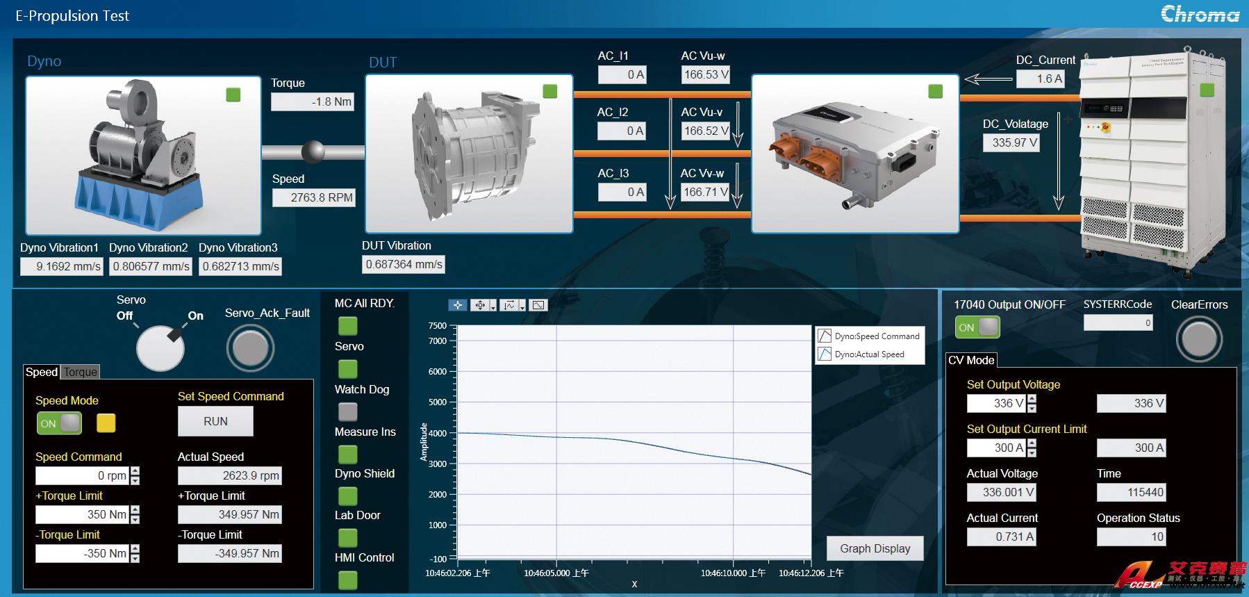 系統(tǒng)具有過(guò)流保護(hù)、過(guò)壓保護(hù)、欠壓保護(hù)、短路保護(hù)、電源缺相識(shí)別、系統(tǒng)溫度監(jiān)控等保護(hù)機(jī)制及過(guò)載響應(yīng)警告功能。其E-Propulsion Test 系統(tǒng)控制軟體具有載入DBC、關(guān)聯(lián)DBC、手動(dòng)控制與監(jiān)測(cè)資料等;測(cè)試介面可以實(shí)時(shí)顯示測(cè)試的瞬時(shí)值(電壓、電流、轉(zhuǎn)速、轉(zhuǎn)矩、輸入功率、輸出功率、效率、溫度等),并可按一定的時(shí)間(可設(shè)定) 采集數(shù)據(jù)。同時(shí)在測(cè)試過(guò)程中曲線(xiàn)繪制,產(chǎn)出報(bào)表,包含測(cè)試過(guò)程的曲線(xiàn)圖 (電壓、電流、轉(zhuǎn)速、轉(zhuǎn)矩、輸入功率、輸出功率、效率、溫度等)。系統(tǒng)采開(kāi)放式軟體管理架構(gòu),具有快速連結(jié)試驗(yàn)室相關(guān)測(cè)試及安全監(jiān)控之設(shè)備能力,并配置振動(dòng)監(jiān)控模組,同步監(jiān)控臺(tái)架與試驗(yàn)件運(yùn)行狀態(tài),借以完成一體化實(shí)驗(yàn)室整合及管理。