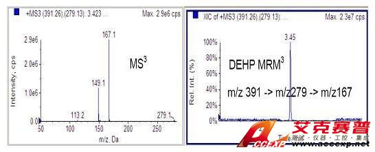 QTRAP復合型質譜儀可以通過MRM3來進行母離子-子離子-三級離子三重選擇,消除基質干擾,實現高選擇性定量,選擇性和特異性比普通的MRM更強,能夠有效解決假陽性問題。以DEHP為例,典型圖譜如下圖,大大提高了靈敏度和選擇性。