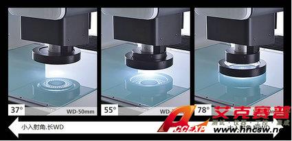 類型1、2和3配有8段LED內外環形照明器,能夠提供最佳照明條件,清晰呈現模糊的邊緣。您可以從8個照明器段的任意方向選反37度、55度、和75度這三個斜角之一,還可以組合使用任意照明器段以及使用任意光強度。