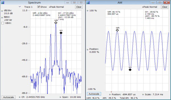 SignalVu-PC 標配AM 和FM 信號分析功能。下面的屏幕圖顯示了把載波調制到48.9% 總AM 的1 kHz 音調幅度。頻譜畫面上使用標記以1 kHz 偏置距載波12.28?dB 測量調制邊帶。調制畫面同時查看相同的信號,顯示了AM 隨時間變化及+Peak、-Peak 和總AM 測量。選項SVA 提供了模擬音頻調制高級測量,包括SINAD、THD 和調制速率。