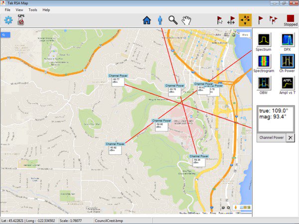 SignalVu-PC MAP應用實現了干擾搜尋和位置分析功能。方位角功能可以在繪制的測量地圖上畫線或畫箭頭,指明進行測量時天線指向的方向,確定干擾位置。還可以創建和顯示測量標簽。