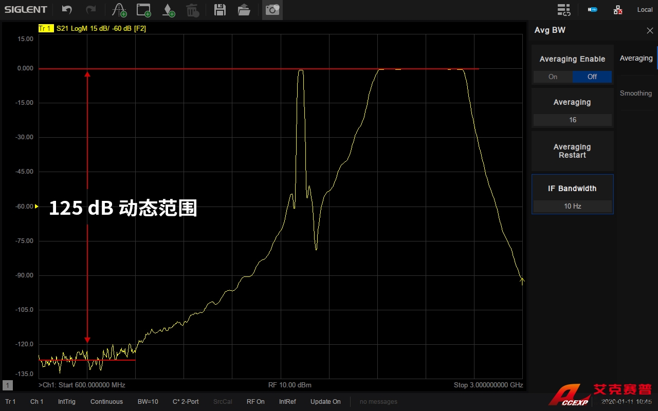系統動態范圍是VNA一個非常重要的指標,它是VNA源的最大輸出功率與測試端口本底噪聲的差值。SNA5022A 擁有最大125 dB的動態范圍,可適用于對動態范圍要求比較高的測試場景,比如同時測量濾波器的通帶和帶外抑制性能。
