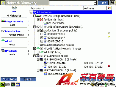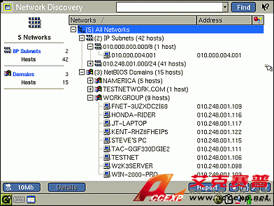EtherScope 通常可按 IP 子網、NetBIOS 域名和 IPX 網絡對所發現的設備進行組織。子網詳細信息包括地址范圍和子網掩碼,而域詳細信息則可區分主瀏覽器和域控制器。通過方便易用的查找功能,您可使用全名或部分名稱、IP 地址或 MAC 地址來搜索所有網絡,以快速查明設備的每次出現情況。