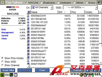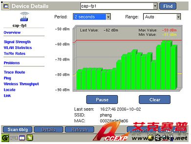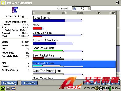問題是同信道干擾引起的嗎?信號強度是否太低,無法支持所有用戶?無線 EtherScope 不斷掃描 2.4GHz 和 5GHz 頻率,讓您明察無線 LAN 的范圍和性能。下拉菜單中包括信號強度、信噪比、利用率及其它一些有用的測量,您可以用它來選擇要查看的測量。迅速確定是否為正確的信道配置接入點,環境的 RF 傳輸功率是否正確。