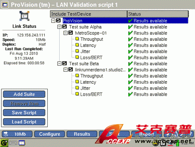 進行整套測試需要涉及一種或多種 RFC 2544 或高級測試。對于每種端到端性能測試,可通過定義目標設備來指定要測試的局域網或廣域網鏈路。并使用不同的配置多次測試同一條鏈路來觀察性能的差異。同時,還應使用多個遠端設備測試同一個目標設備的多條鏈路。為每項測試添加“成功/失敗”極限值,以使每個人都可以容易地了解測試結果。只需單擊“開始”按鈕,即可通過一項自動化的操作執行整套測試。隨后查看并保存表格結果和圖形結果以記錄鏈路性能。