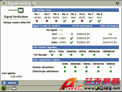 測試 802.3af 以太網供電(PoE)鏈路。EtherScope 系列 II 可模仿 802.3af 帶電設備以請求并測量每針上的電壓。