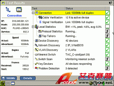 EtherScope 分析儀的自動測試結果主屏幕和三色 LED 可提供大量信息,使用戶能即時查看到網絡狀態。多項測試同時運行,加速發現問題。選擇任意單獨測試可在左側預覽窗格中顯示其概要信息,點擊“詳細信息”可獲得深入的測試信息。