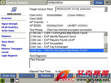 無線 EtherScope 將發現基礎設施和客戶端設備使用的是否是正確的驗證機制。使用無線 EtherScope 的登錄測試工具來測試和監測 EAP(可擴展驗證協議)驗證。使用無線 EtherScope,強制無線客戶端與接入點斷開連接,當客戶端在網絡上重新驗證時監測客戶端和接入點 EAP 的交換。此外,還可以發現 EAP 驗證過程是否出現中斷,以及出現中斷的位置和時間。