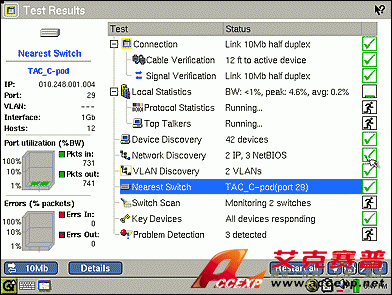 EtherScope 分析儀的自動網絡發現的網絡發現結果顯示在主屏幕上,其中包括最近的交換機以及您連接的插槽和端口的標識信息。