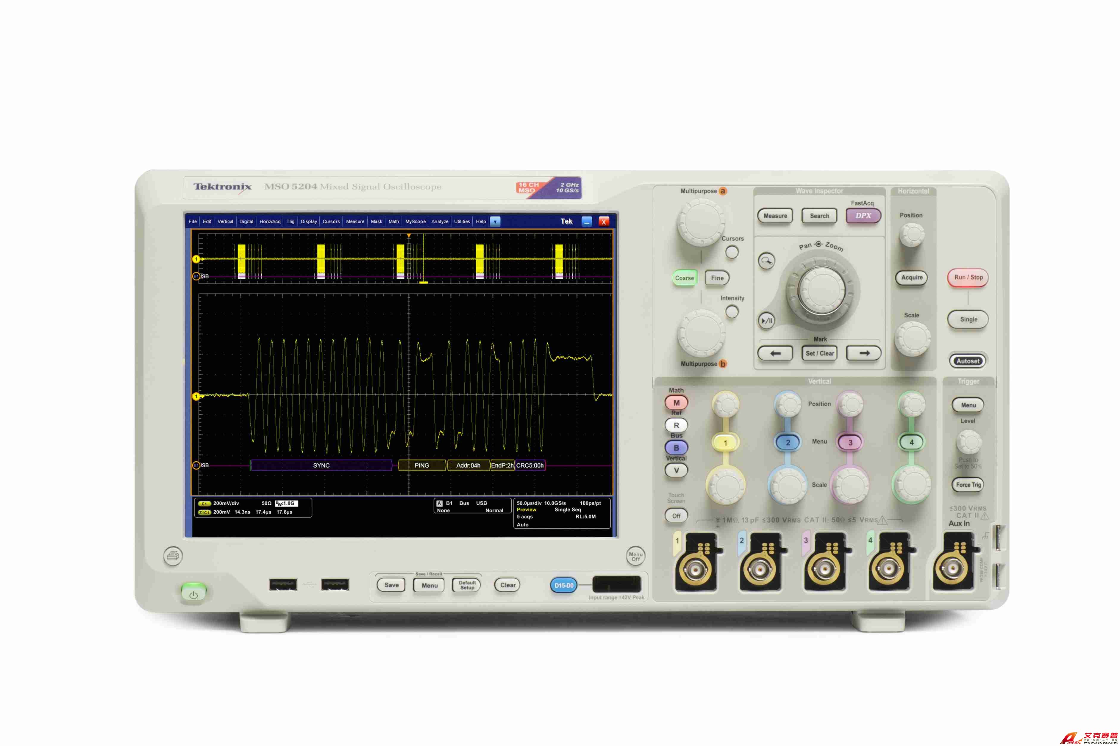Tektronix DPO5104示波器在一臺儀器上分析模擬信號和數字信號,在系統級調試復雜的設計。