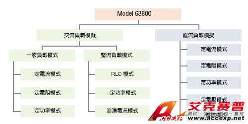 63800系列交/直流電子負(fù)載,主要是提供交流及直流負(fù)載模擬使用。下列樹狀圖為可提供的各種負(fù)載模式。