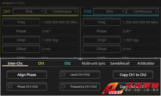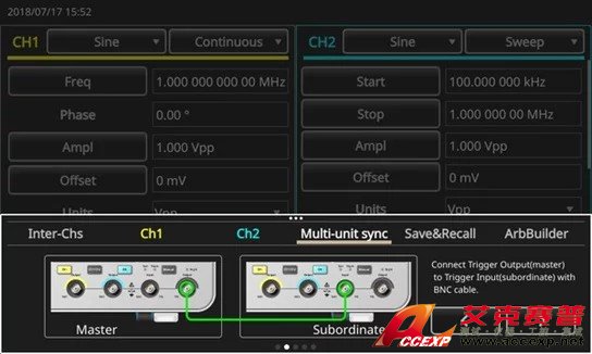 AFG31000 簡化了這個過程,它在屏幕上有一個向?qū)Чぞ撸梢砸龑?dǎo)用戶完成電纜連接和設(shè)置配置,實現(xiàn)多臺發(fā)生器同步。