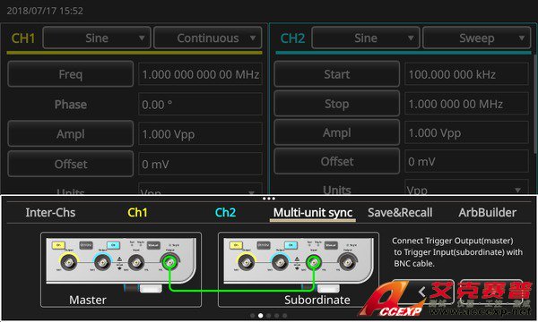 AFG31000 簡化了這個過程,它在屏幕上有一個向?qū)Чぞ撸梢砸龑?dǎo)用戶完成電纜連接和設(shè)置配置,實現(xiàn)多臺發(fā)生器同步。