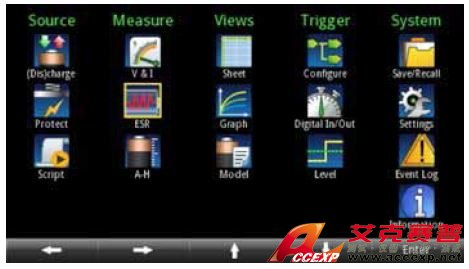高亮度4.3 英寸TFT 顯示器用大的易讀字符顯示電壓、電流 和安時讀數(shù)、源設置及許多其他設置?;趫D標的主菜單提 供了用戶可以控制和設置的所有功能,可以快速進入源設置、 測量設置、顯示格式、觸發(fā)選項和系統(tǒng)設置。菜單簡短,所 有選項容易查找且描述清楚,可以使用導航輪、數(shù)字鍵盤或 軟鍵迅速設置測試參數(shù)。許多設置參數(shù),如電壓和電流設置, 可以直接從主屏輸入;不復雜的測試無需進入主菜單進行設 置,就可以在主屏上使用軟菜單進行調(diào)節(jié)。不管測試要求簡 單還是復雜,Series 2281S 電源都為設置所有要求的參數(shù)提 供了一種簡便方式。