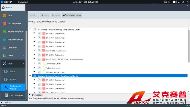 R&S?ELEKTRA 附帶一個(gè)大型測試模板庫,可針對常見的 EMC 測量隨時(shí)運(yùn)行測試。您只需連接儀器、配置各個(gè)硬件,即可開始測試。