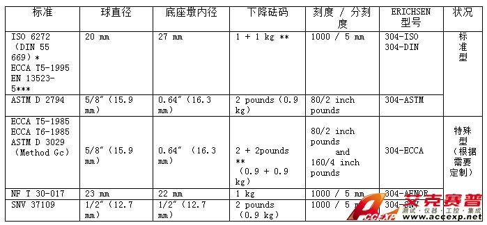 球 ( 沖頭 ) 直接落到涂層上,以獲得一個(gè)中凹的變形 ( 下沉 ) 或在另一面獲得一個(gè)中凸的變形 ( 突出 ) 。標(biāo)準(zhǔn)列表提供給用戶在兩者間的一個(gè)選擇;用戶須選擇或制定一種方法。以下情況例外: ECCA 標(biāo)準(zhǔn) (T5 和 T6) 清楚指明,必須使用中凸變形。