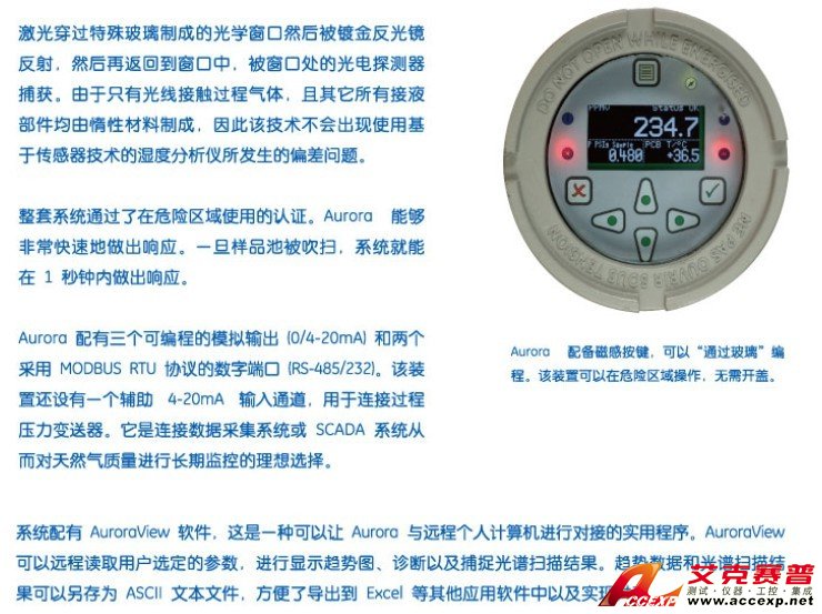 Aurora 來自GE基于最新可調(diào)諧二極管激光吸收光譜(TDLAS)技術(shù)的水份分析儀。 具有精確,可靠,實時監(jiān)控天然氣中水份含量的特點,可確保燃氣的最大在線供應。與傳統(tǒng)技術(shù)需要擠個小時相比,Aurora只要幾秒鐘就可以測出天然氣管道中的水份含量。